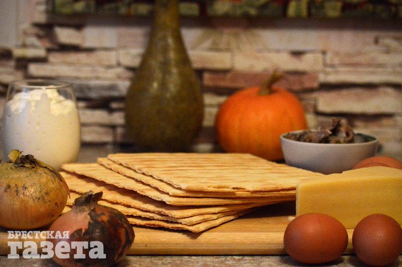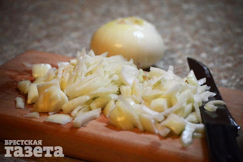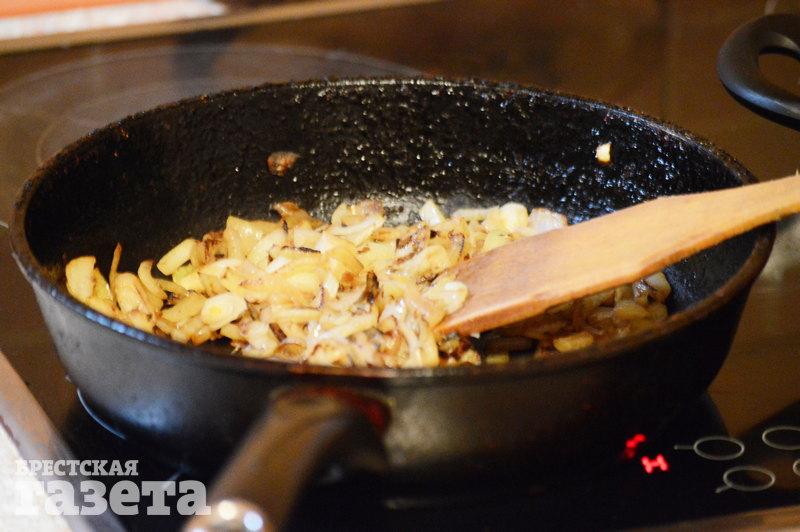 Лук очистите, порежьте его на четверть кольца и спассеруйте на растительном масле. Готовый лук смешайте с 50 г майонеза.