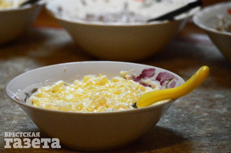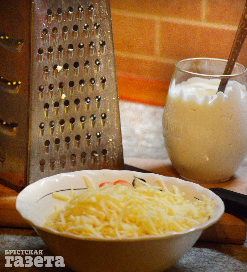 Сыр натрите на крупной терке и добавьте половину оставшегося майонеза.