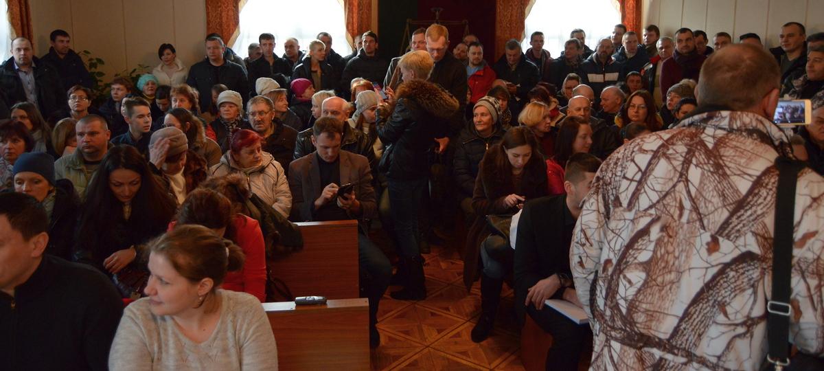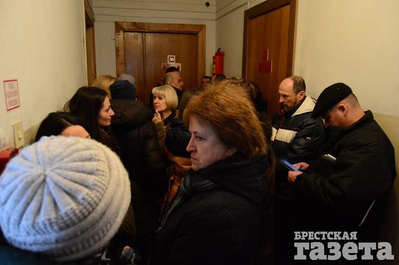 В начале заседания судья Алексей Карагода попросил удалиться тех, кто не смог присесть, объяснив это требованиями правил пожарной безопасности. Люди начали возмущаться маленькими размерами помещения, которое было предоставлено для слушания такого резонансного дела. Но затем стоявшие присели на корточки и заседание началось. Чтобы в переполненном зале людей не стало еще больше, его закрыли на ключ.