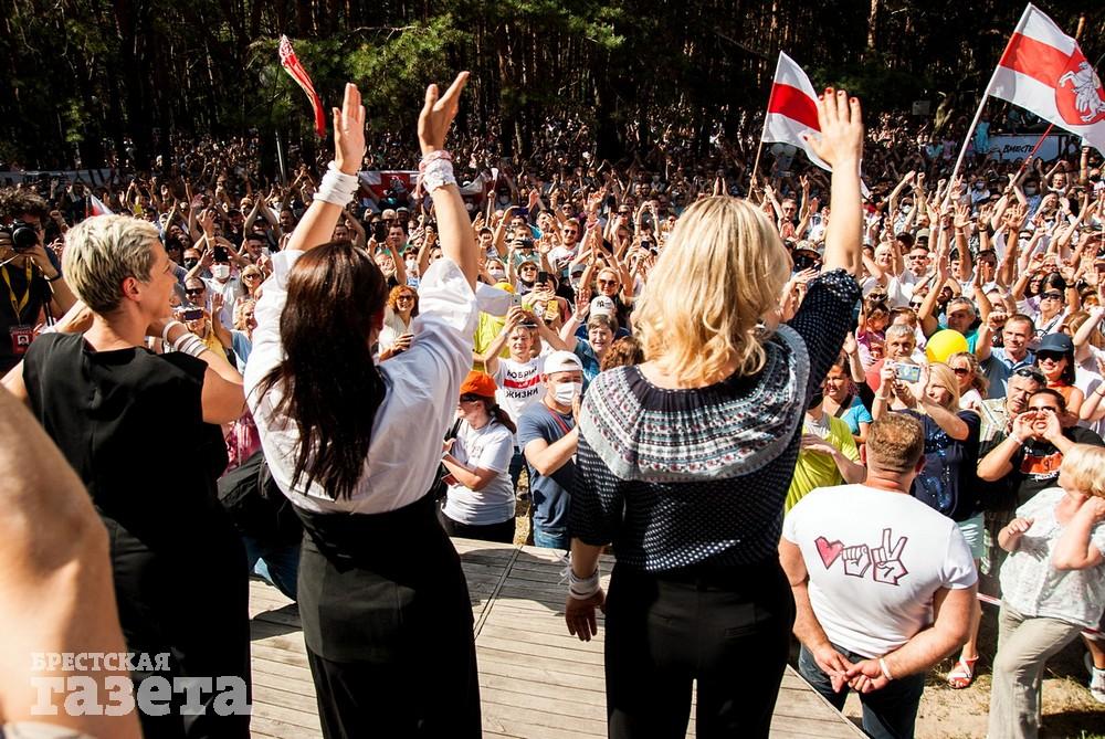 Представительницы объединенных штабов прибыли на митинг с некоторой задержкой. Дело в том, что сотрудники ГАИ несколько раз проверяли машины кортежа Светланы Тихановской по дороге в Брест. Плюс, у одной из машин, кто-то порезал колесо. И когда, наконец, три грации нынешней электоральной кампании (как их назвала Лидия Ермошина), Светлана Тихановская и ее соратницы из объединенного штаба претендентов на пост президента Мария Колесникова и Вероника Цепкало вышли к собравшимся под гимн протестного движения «Стены рухнут», то были встречены громкими аплодисментами и радостными возгласами.