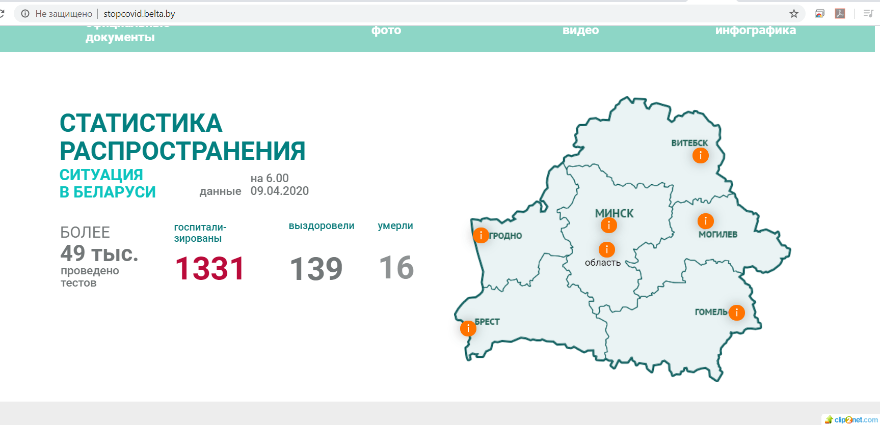 По данным на 6 утра 9 апреля, в Беларуси проведено более 49 тыс тестов на COVID-19, зафиксировано 1 486 случаев коронавируса. В больницах находится 1 331 пациент, выздоровели 79, умерли 16.