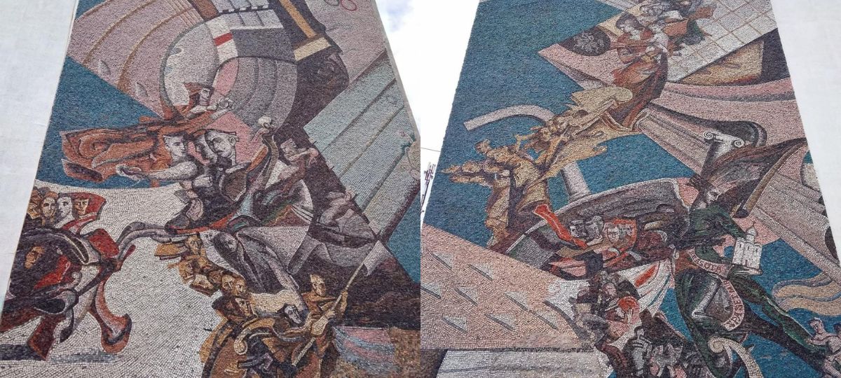 Почему мозаики закрасили, неизвестно. Возможно, все дело в изображенной на них беларуской национальной символике: бело-красно-белых флагах и гербе «Погоня» (напомним, он является историко-культурной ценностью и внесен в Государственный список историко-культурных ценностей Беларуси).