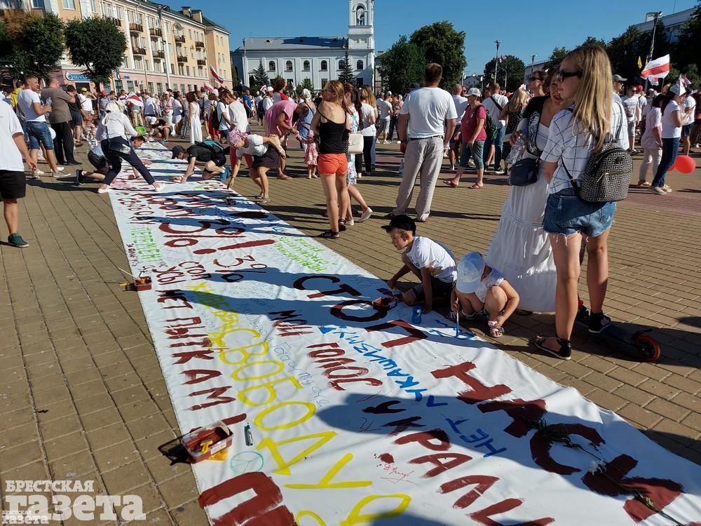 Брестчане растянули бело-красно-белый флаг длиной в 100 метров. Люди все еще подтягиваются к площади.