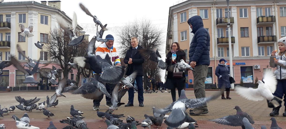 В этот раз в кормлении голубей приняли участие депутат палаты представителей национального собрания РБ Анна Канопацкая и бывший кандидат в президенты Беларуси, сопредседатель незарегистрированной партии Белорусская Христианская Демократия Виталий Рымашевский.