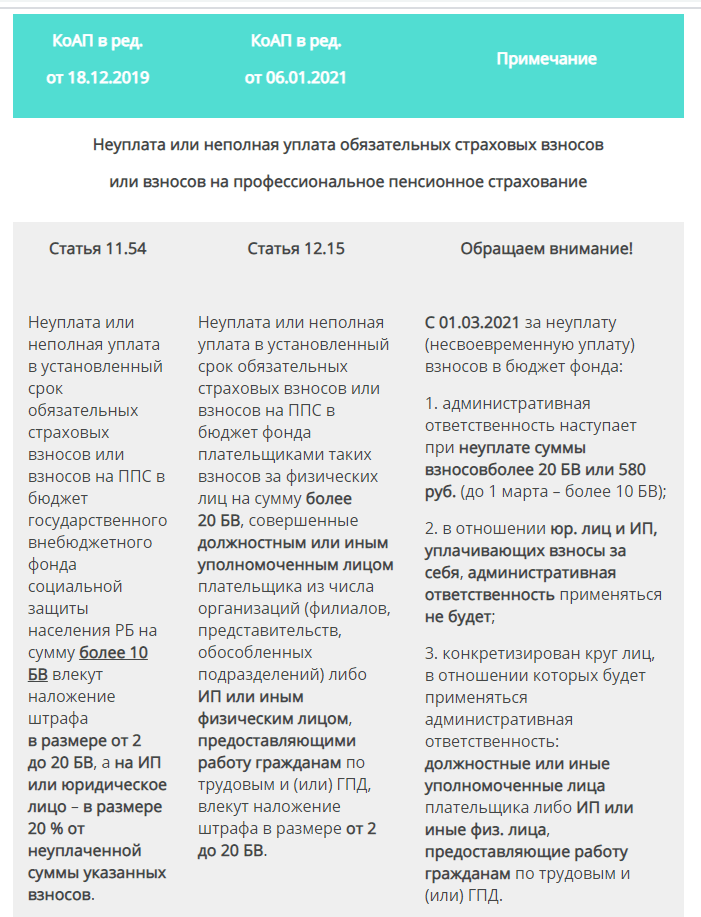 С 1 марта этого года в Беларуси вступает в силу новый Кодекс об административных правонарушениях. Некоторые изменения касаются ответственности за нарушения уплаты обязательных страховых взносов или взносов на профессиональное пенсионное страхование в Фонд социальной защиты населения, рассказали в ФСЗН. Изменения отражены в таблице: