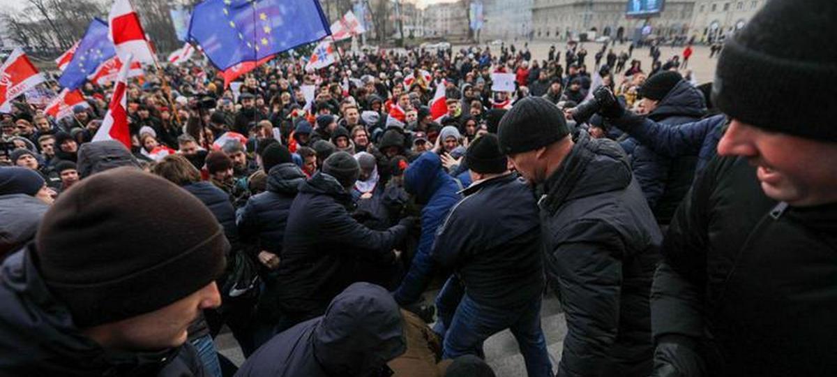 Люди попытались подняться на ступеньки Дворца Республики, милиционеры выстроились цепью и не пустили их, случилась потасовка. Собравшиеся скандируют: «Фа-шис-ты!». Из раций милиционеров слышен голос: «Спокойнее, спокойнее работаем».
