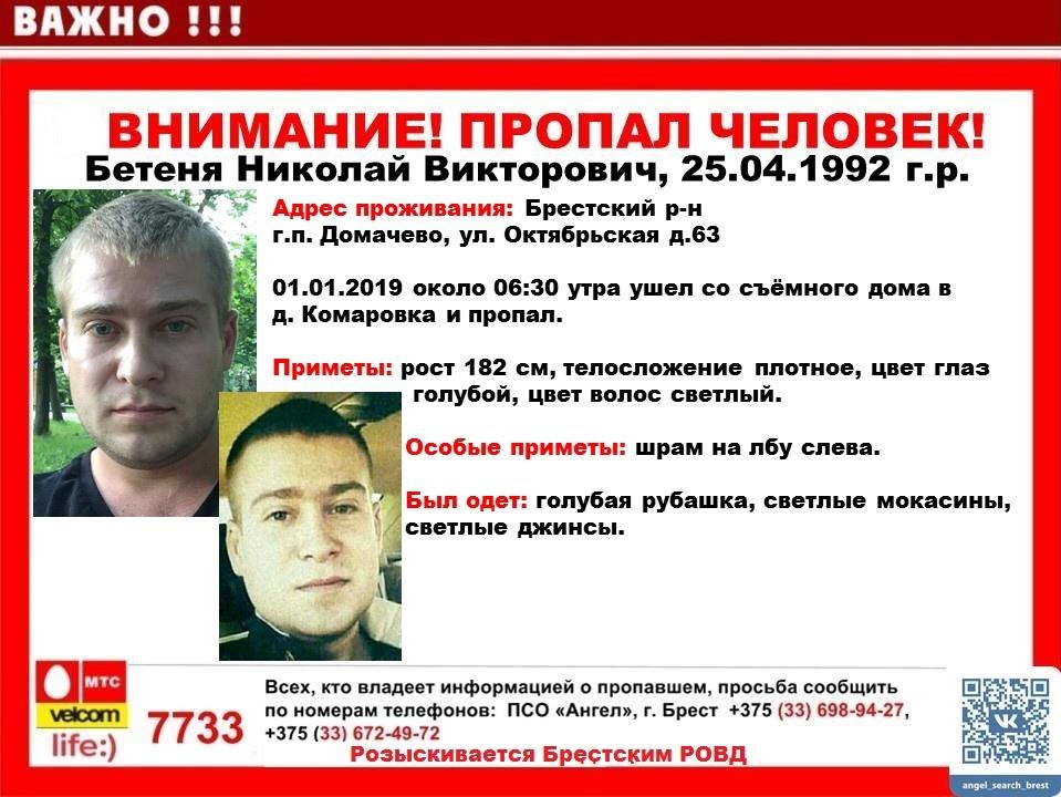 Николай Викторович Бетеня, проживающий в г. п. Домачево на ул. Октябрьской, 63, пропал 1 января. По информации ПСО «Ангел», молодой мужчина ушел со съемного дома (д. Комаровка) около 06.30 после конфликта и пропал. С тех пор о его местонахождении ничего не известно.