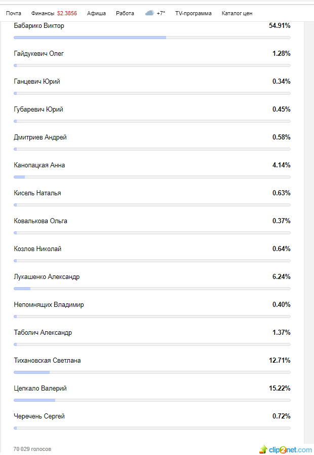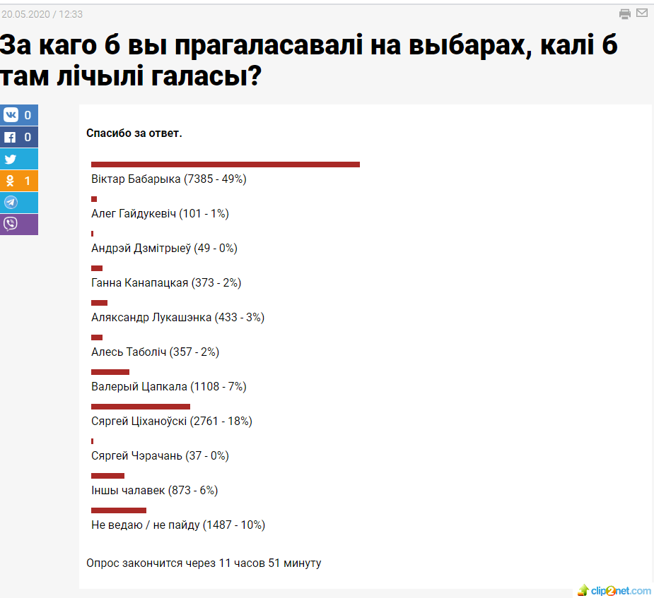 На портале tut.by на утро пятницы участие в опросе приняли более 70 тысяч человек. Здесь тоже лидирует Виктор Бабарико – в случае, если его имя окажется в избирательном бюллетене, отдать свой голос за него готовы почти 55% из проголосовавших. На втором месте – основатель Парка высоких технологий Валерий Цепкало (у него чуть больше 15%), на третьем – Светлана Тихановская, которая пошла на выборы после того, как Центризбирком не зарегистрировал инициативную группу по сбору подписей за ее мужа, блогера Сергея Тихановского – у нее 12,71%. В поддержку Александра Лукашенко высказались только 6,24%.