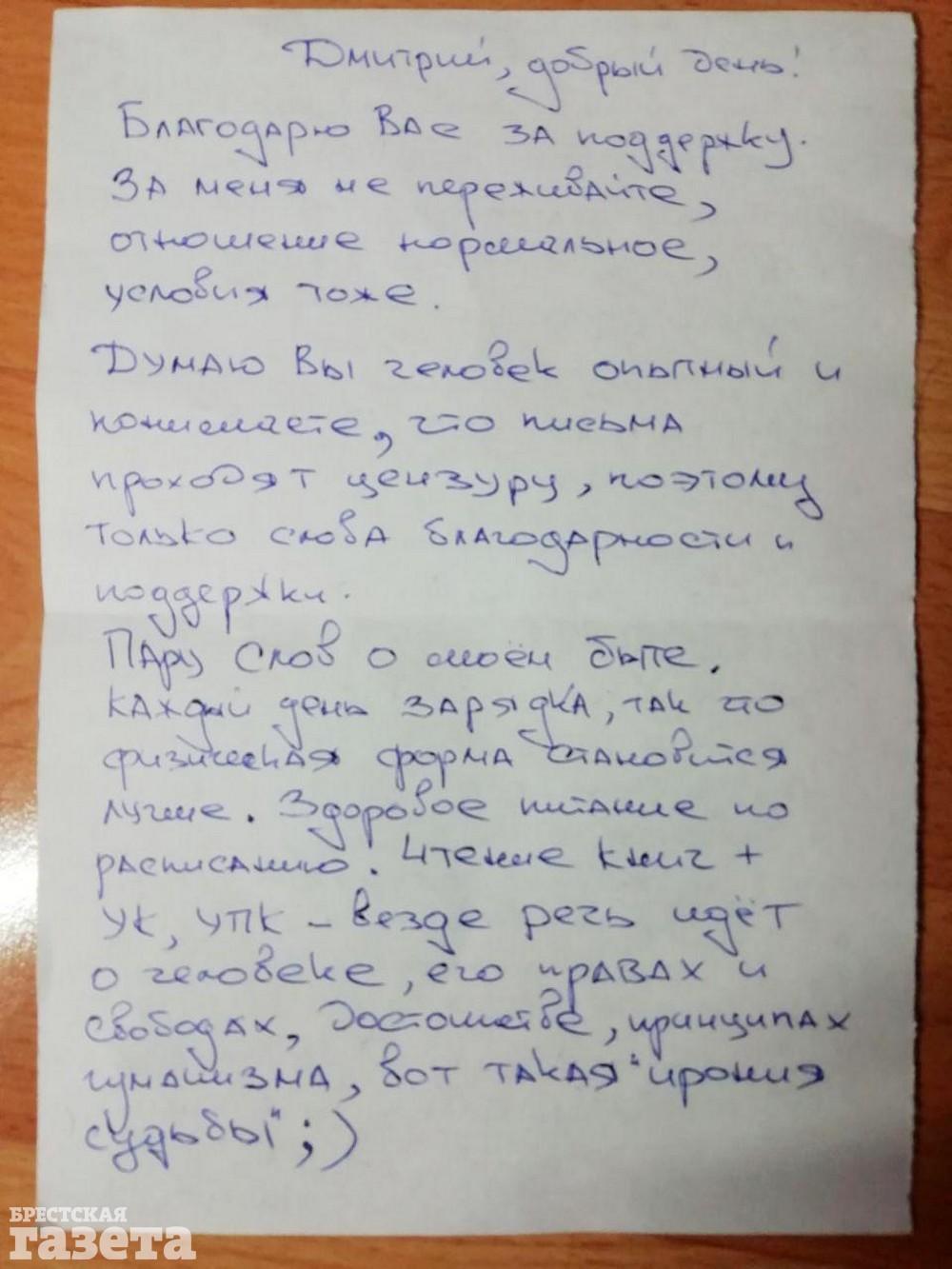 Активист движения по борьбе с аккумуляторным заводом Дмитрий Андросюк, который ранее в ответ на свои открытки получил письма от находящихся в СИЗО в Минске блогеров Александра Кабанова и Сергея Петрухина, поделился с «БГ» еще одним письмом, на этот раз от блогера Владимира Цыгановича (MozgON).