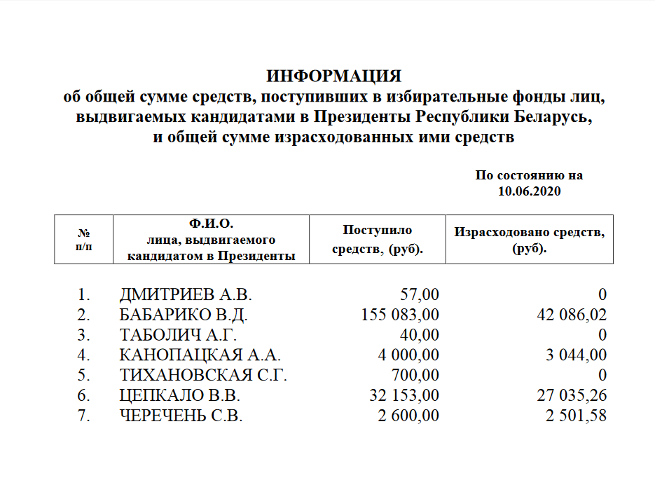 По информации штаба, на расчетном счете находятся денежные средства избирательного фонда в сумме более 100 тысяч белорусских рублей.