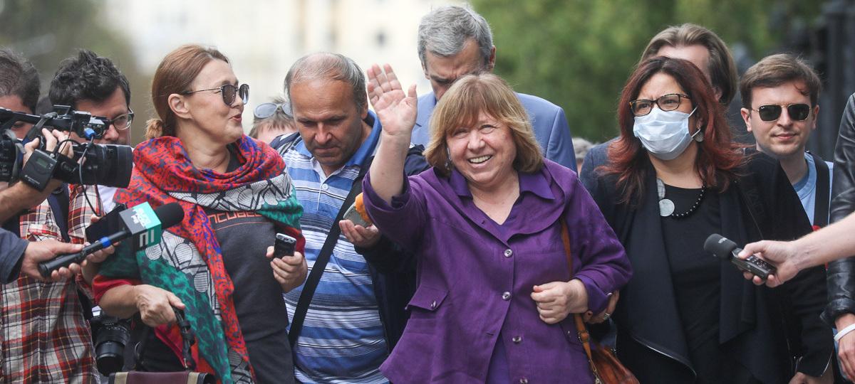 Светлана Алексиевич приехала к зданию СК 26 августа с членами Координационного совета Максимом Знаком, Павлом Латушко и Марией Колесниковой. Поддержать Алексиевич пришли люди, они встретили ее аплодисментами, пишет tut.by.