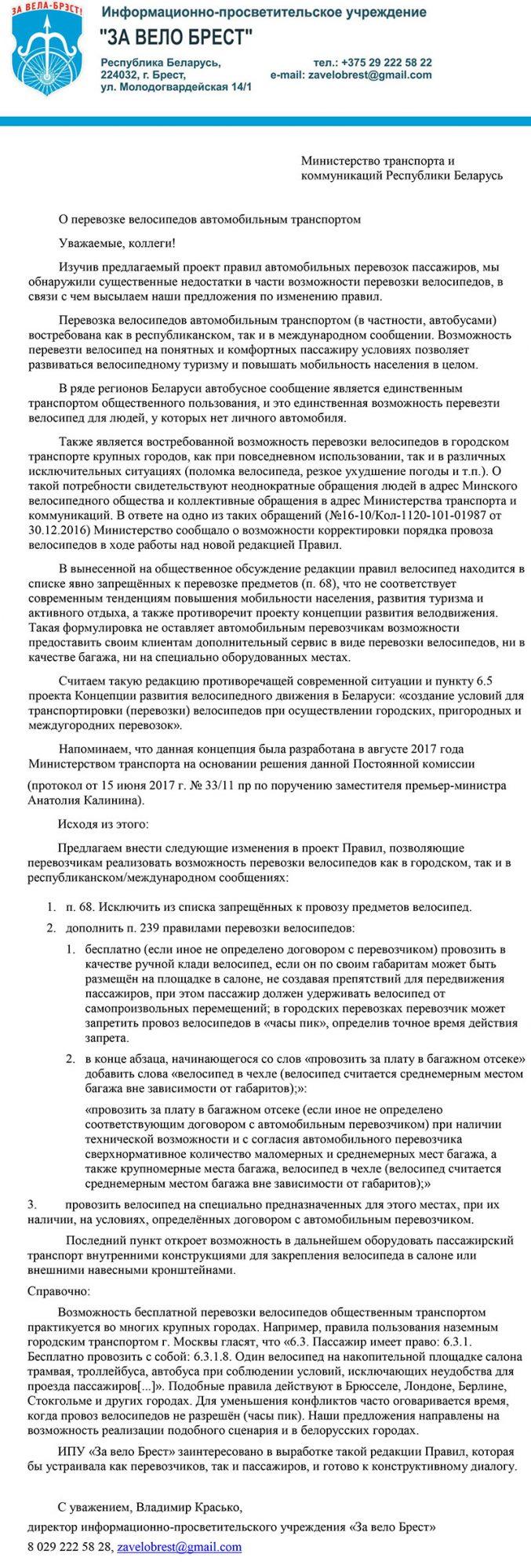 Информационно-просветительское учреждение «За вело-Брест» в рамках поддержки кампании Минского велосипедного общества направило обращение в Министерство транспорта и коммуникаций Республики Беларусь. Под петицией подписались почти 550 человек.