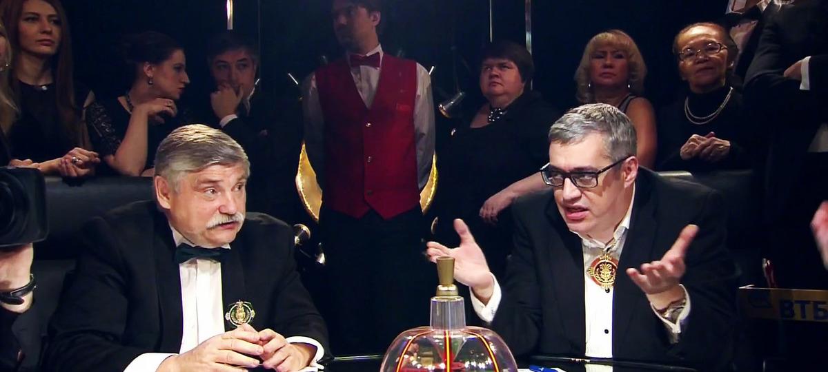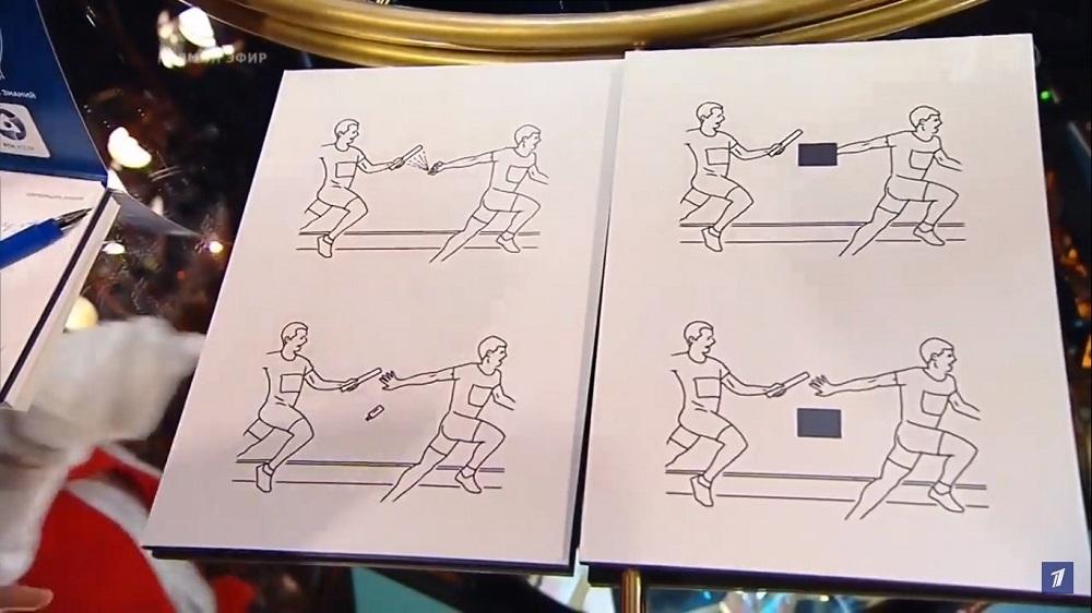 Василий Станчук попросил знатоков изучить карикатуру художника Tango. На ней изображен момент передачи эстафетной палочки от одного легкоатлета к другому. Один из нарисованных мужчин держит в руках какой-то предмет, а после приема палочки бросает его на землю. Василий Станчук закрасил этот предмет черным квадратом и попросил знатоков назвать его.
