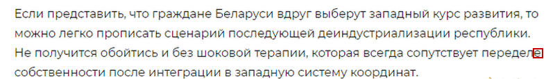 «Если представить, что граждане Беларуси вдруг выберут западный курс развития, то можно легко прописать сценарий последующей деиндустриализации республики. Не получится обойтись и без шоковой терапии, которая всегда сопутствует переделе собственности после интеграции в западную систему координат», — берет на себя роль прорицателя интернет-ресурс zviestki.com.