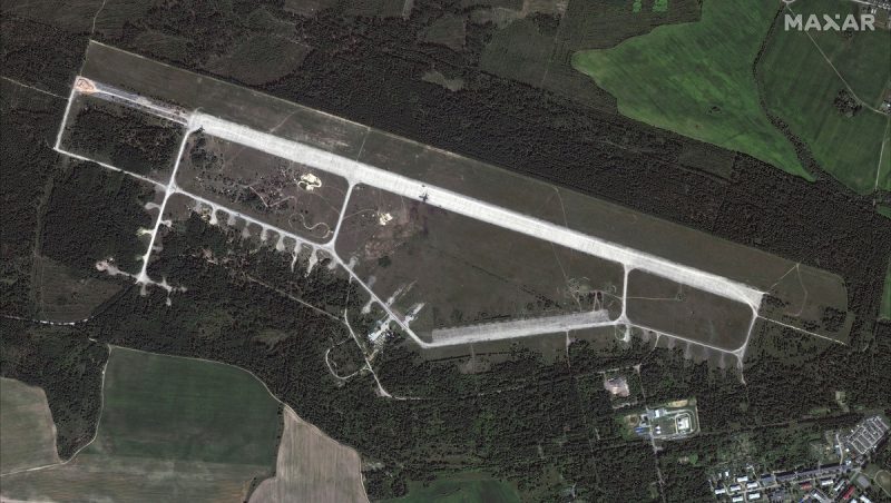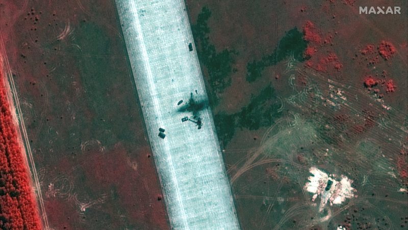 Чуть позже появились спутниковые снимки с аэродрома «Зябровка». Их опубликовала компания Maxar Technologies. На снимках хорошо заметно пятно гари, судя по всему — на взлетной полосе. Это пятно напоминает силуэтом самолет. Рядом с пятном расположено несколько единиц техники — сложно сказать, сгоревшей или нет.
