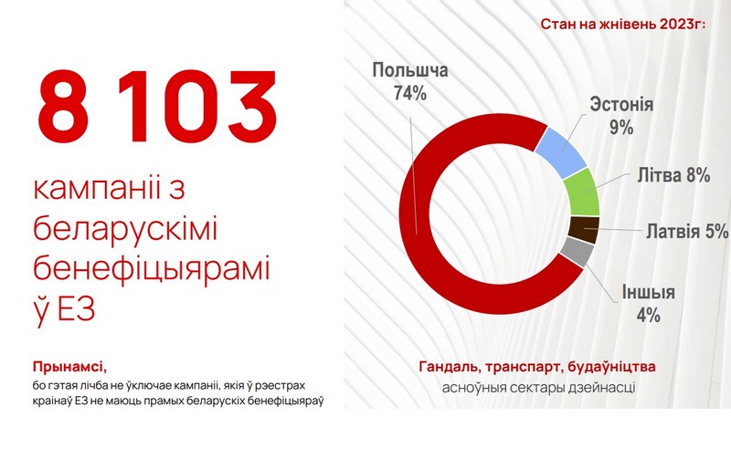 В странах Евросоюза работает 8 103 компании, бенефициарами которых являются беларусы. Из них 74% находятся в Польше, 9% — в Эстонии, 8% — в Литве, 5% — в Латвии, 4% — в других странах ЕС. Три основных сектора — торговля, транспортная деятельность и услуги, а также IT.