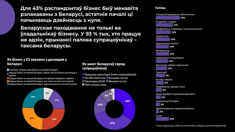 Из участников исследования 43% релоцировали свой бизнес из Беларуси, остальные развивали его в новой стране с нуля. У 93% опрошенных фирм больше половины сотрудников — беларусы.