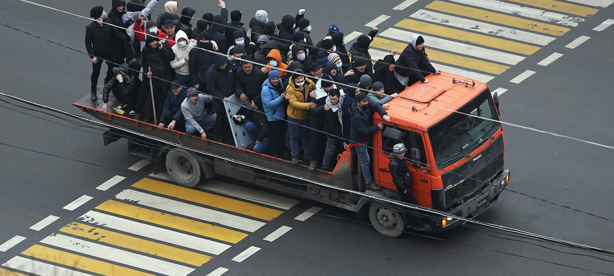 В целом участники демонстраций в Алматы ведут себя агрессивно: они избивают силовиков, поджигают машины, бьют витрины магазинов. В других городах протесты гораздо более мирные. Например, некоторые силовики в Атырау и Актау переходят на сторону демонстрантов, а в Актобе полицейские отказались задерживать протестующих.