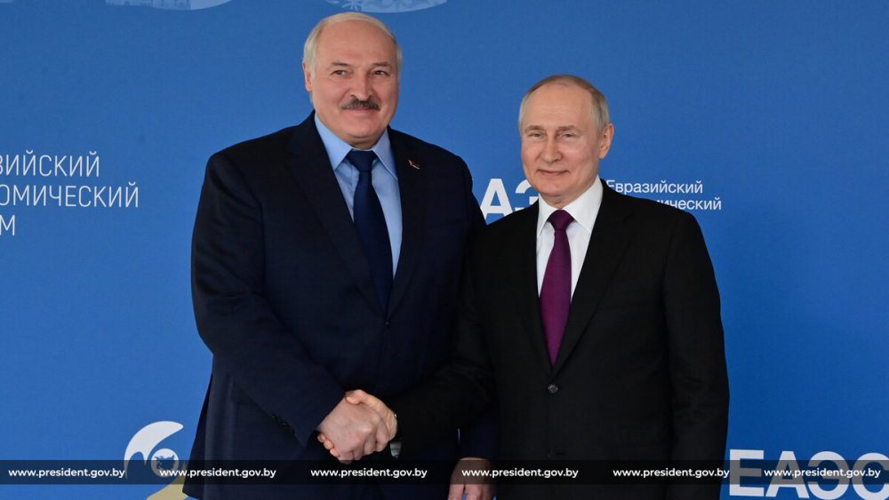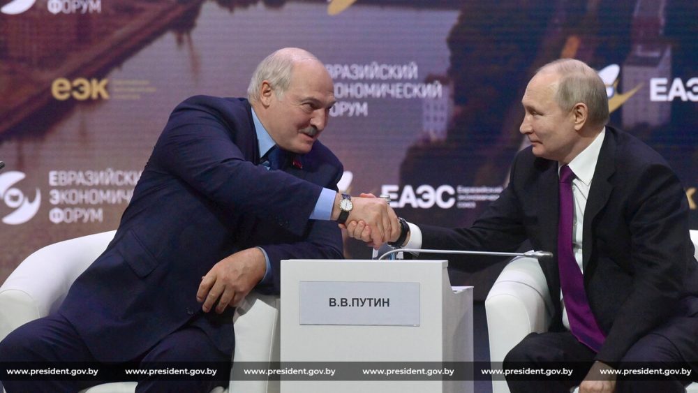 На этих словах Александр Лукашенко и Владимир Путин, которые сидели рядом, пожали друг другу руки.