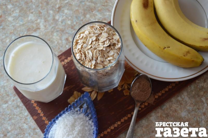 1 ст. овсяных хлопьев, 150 г кефира, 2 банана, кокосовая стружка, корица, сахар и ванилин по вкусу.