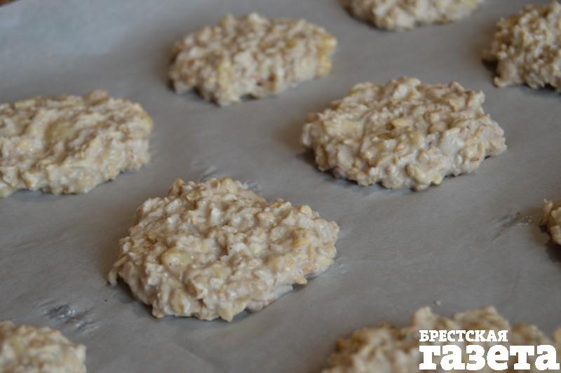 4.Застелите противень пергаментной бумагой, выложите на нее ложкой получившееся тесто в форме круглых лепешек диаметром около 5-6 см.