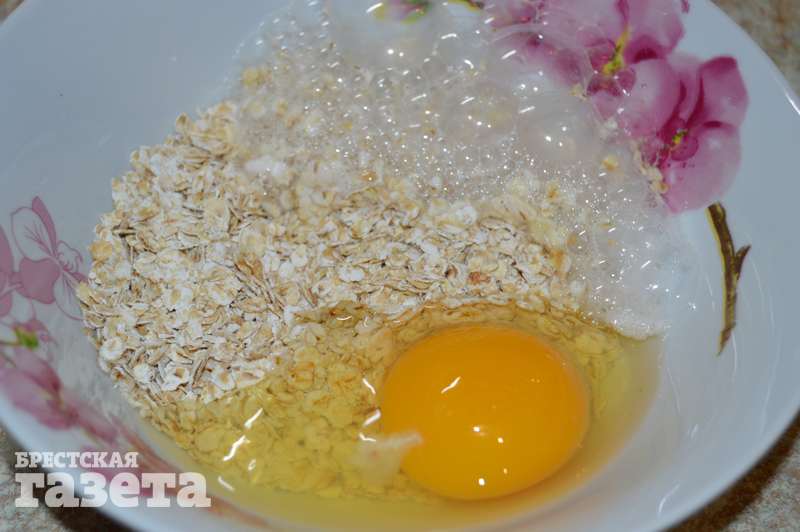 Готовим: Высыпьте овсяные хлопья в миску. Добавьте к ним яйцо и соду, гашенную уксусом.