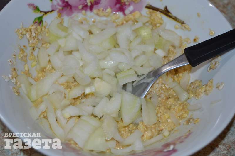 Лук мелко нарежьте и всыпьте в тесто. Все хорошо перемешайте. Добавьте горячую кипяченую воду, посолите и поперчите, все хорошо еще раз перемешайте и оставьте на 15 — 20 минут, чтобы овсянка набухла и получилось более густое тесто.