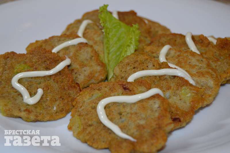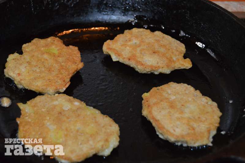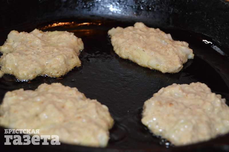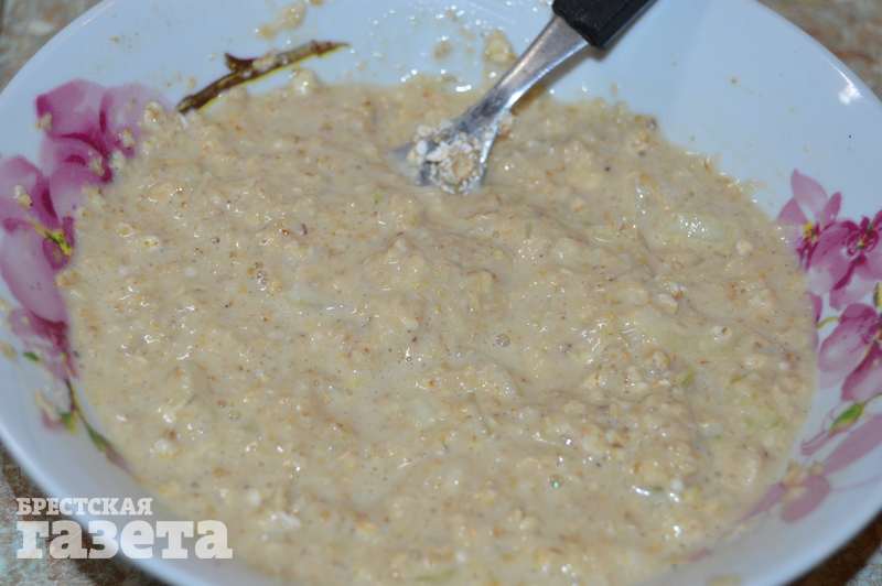Надо: 1 ст. овсяных хлопьев, 0,5 средней луковицы, 1 яйцо, 0,5 ч. л. соды, гашенной уксусом, соль, перец по вкусу, около 0,5 ст. горячей кипяченой воды, растительное масло для жарки.