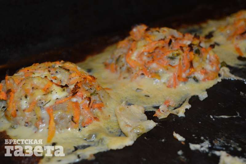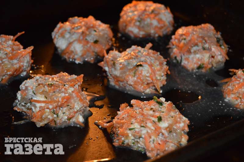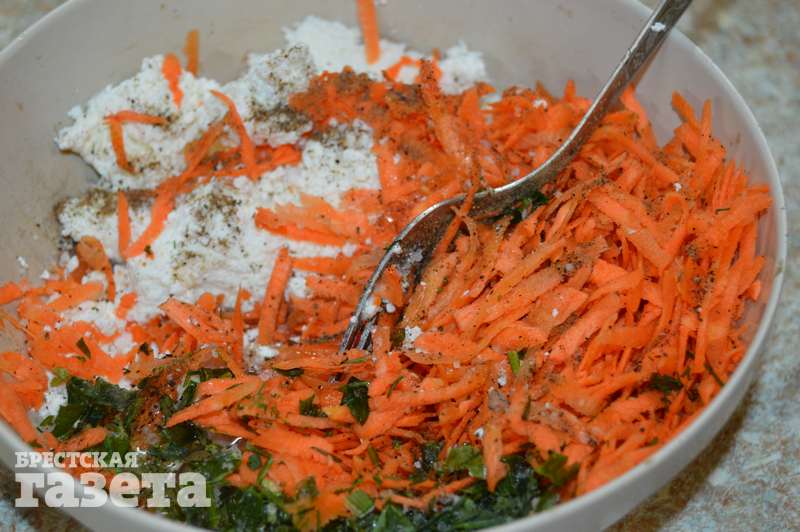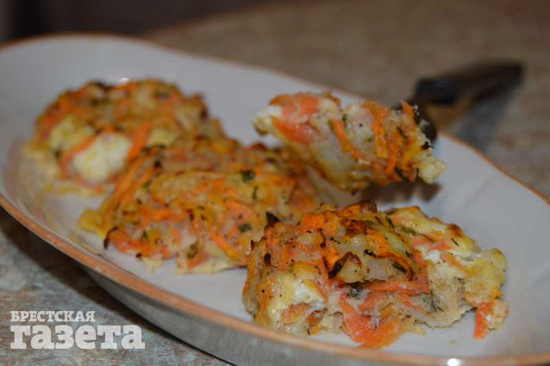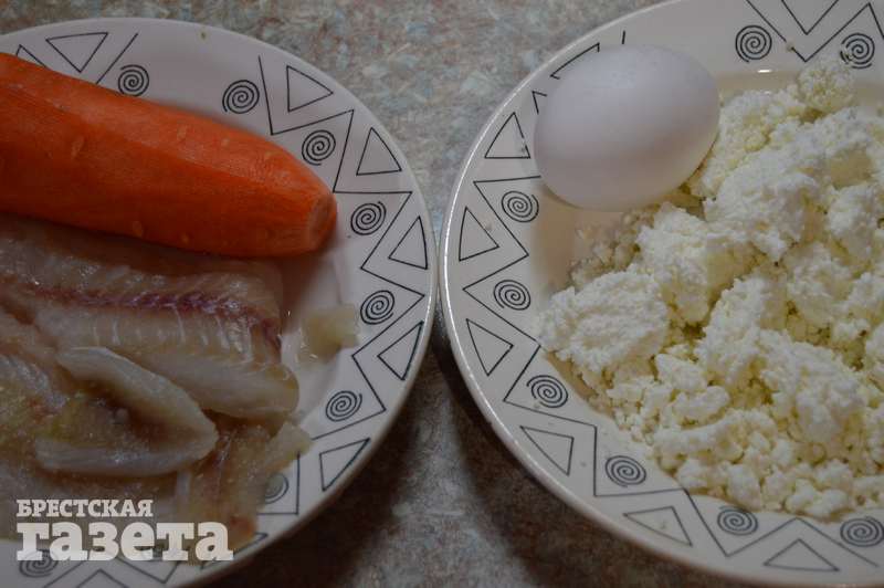 Надо: 150 г филе минтая, 200 г творога, 1 морковь, 1 яйцо, соль, перец, зелень по вкусу, растительное масло.