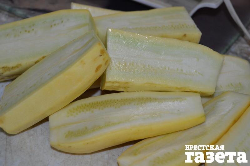 Посолите и поперчите. Чеснок очистите от шелухи и пропустите через пресс. Натрите измельченным чесноком кабачки.