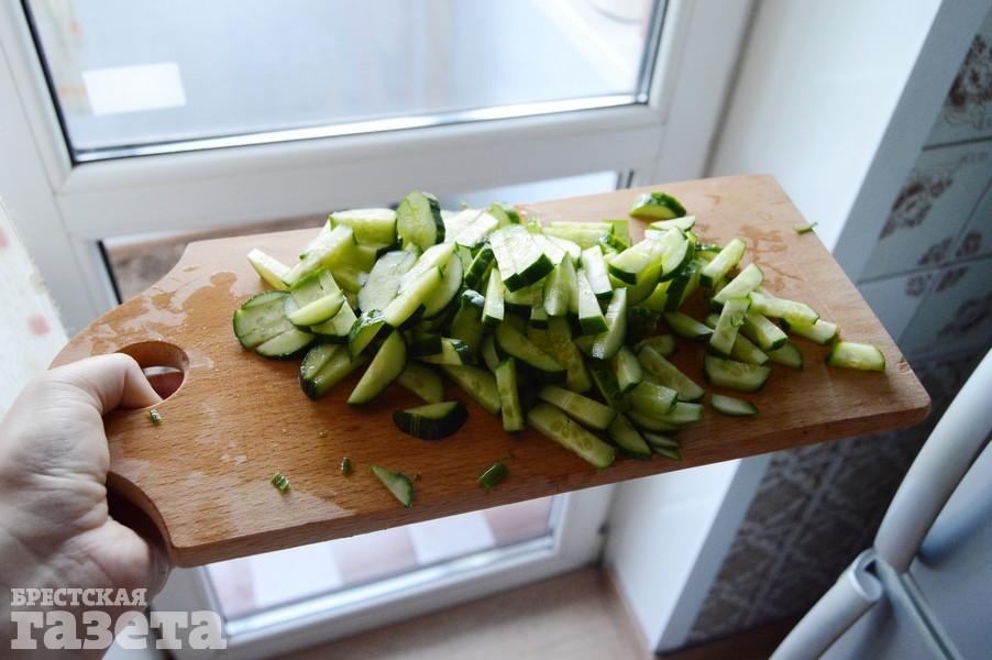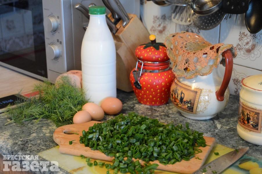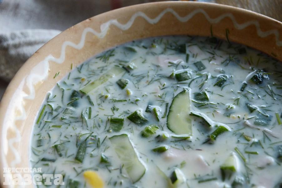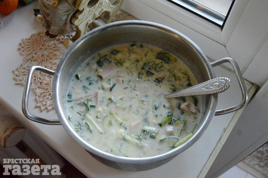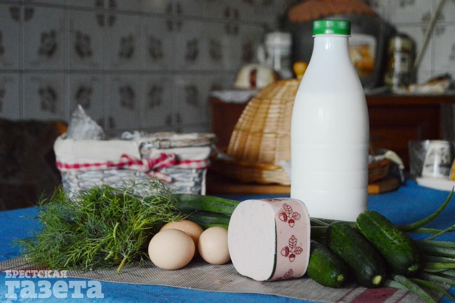 Надо: 1 л кефира, 3 огурца, 3 вареных яйца, 200 г вареной колбасы (сосисок, курятины, говядины и так далее), 1 пучок зелени, 1 пучок зеленого лука, 2 столовые ложки лимонного сока или уксуса, соль по вкусу.