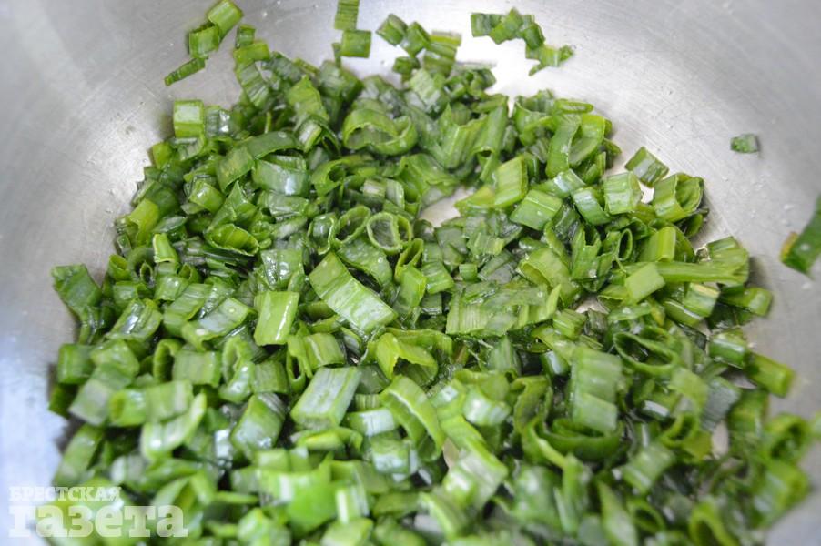 Готовим: Зеленый лук нарежьте колечками и перетрите с солью.