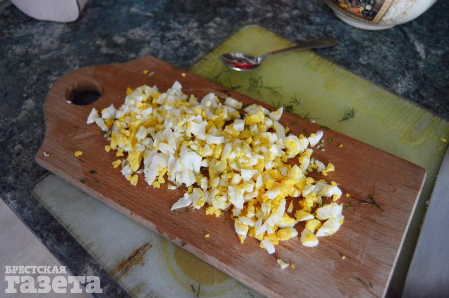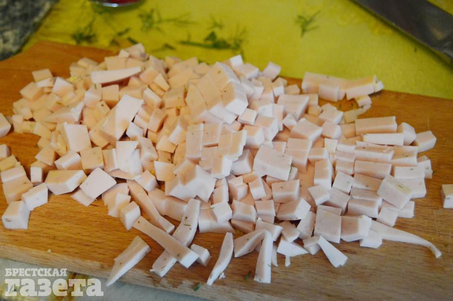 Порежьте кубиками яйца и колбасу, прибавьте к другим ингредиентам.