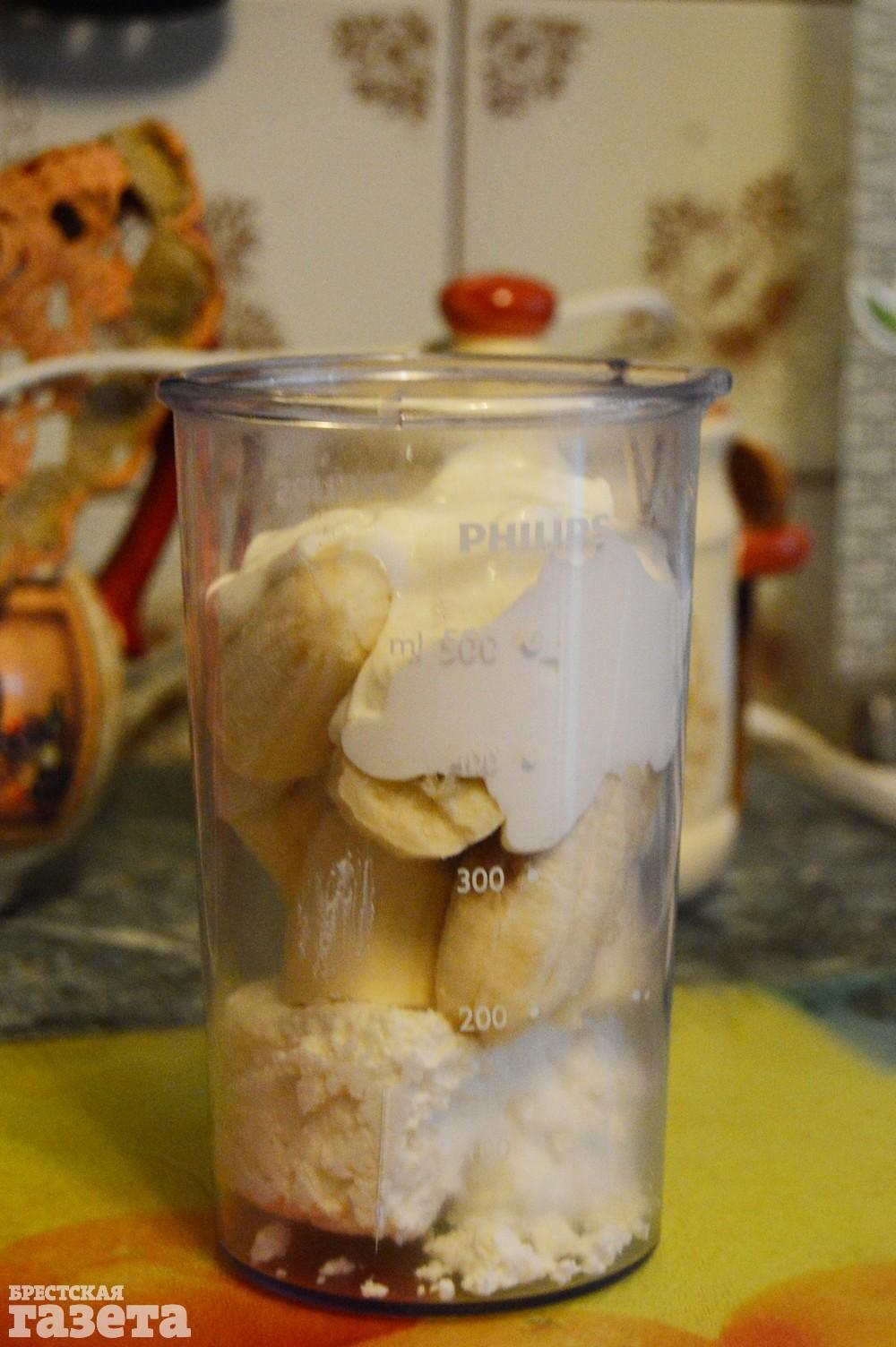 Готовим: Положите в высокую емкость творог, очищенные от кожуры бананы и йогурт.