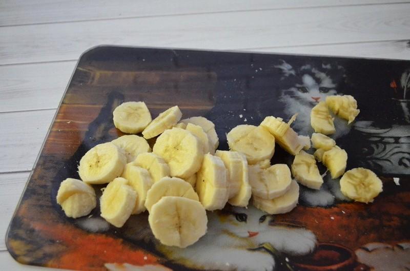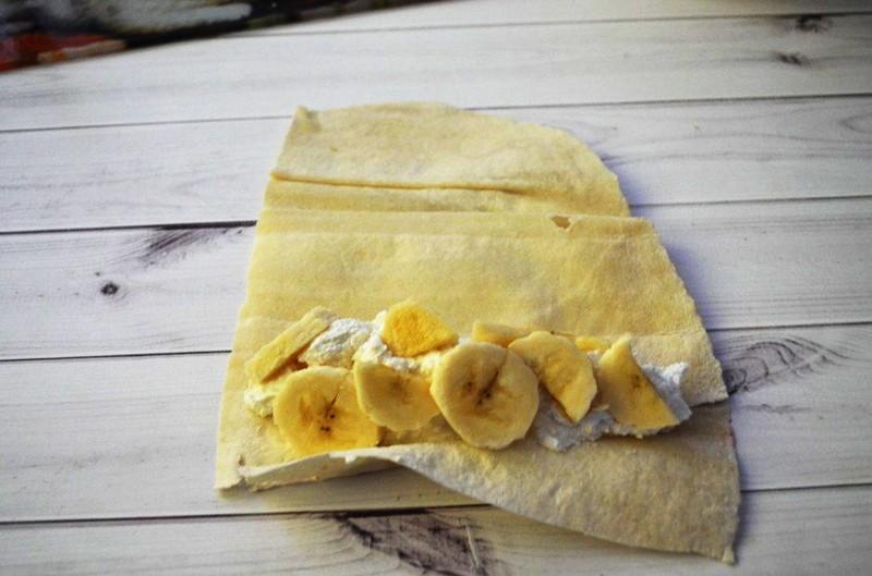 Лаваш порежьте на полоски, выложите на него творог и банан.