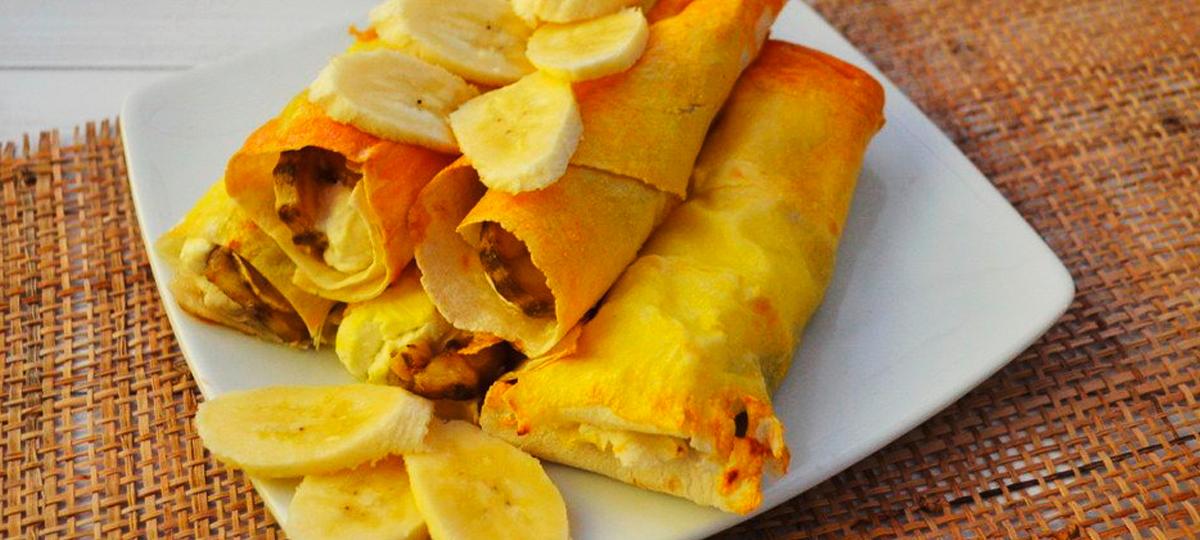 Надо: 1 тонкий лаваш, 200 г творога, 1 банан, 1 яйцо, 3 ст. л. сметаны, ванилин по вкусу.