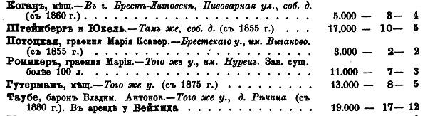 Эти заводы не были единственными: во второй половине 19 века в имении Речица обосновались пивовары генерал Щербинский, Мартин Шульц, Ширма, в самом Брест-Литовске — мещане Гросбаум и Палько. Всего по Брестскому повету Гродненской губернии, согласно «Географическому словарю Царства Польского», на 1880 год насчитывалось 10 пивоварен.