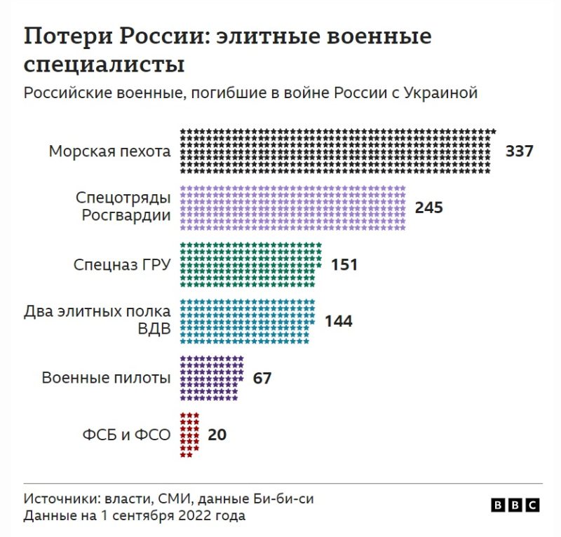 Стремительное контрнаступление Украины в Харьковской области привело не только к тому, что россияне оставили ряд ранее захваченных ими населенных пунктов, но и к потерям личного состава. На основе открытых источников Би-би-си удалось установить, что с 5 по 12 сентября Россия потеряла в Украине более 200 военных, в том числе 57 элитных специалистов — солдат и офицеров спецназа, морской пехоты, лучших частей ВДВ и Росгвардии.