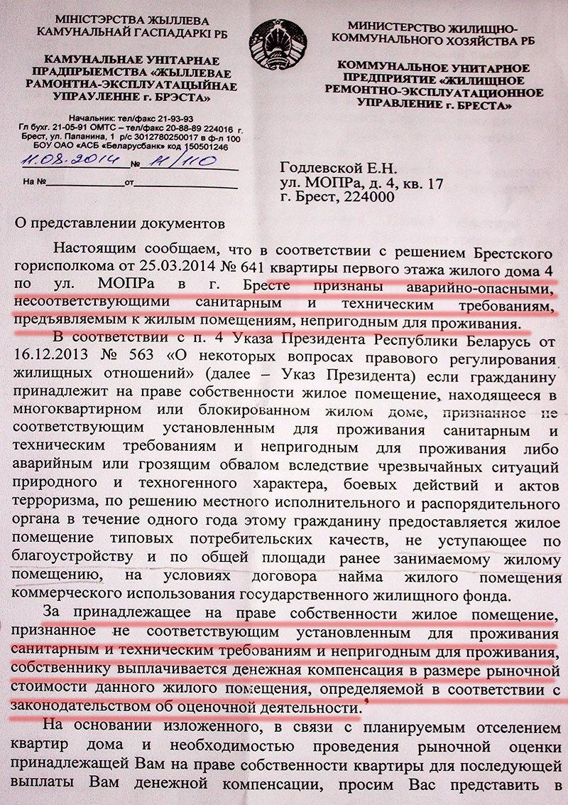 Пункт 4 Указа президента РБ от 16 декабря 2013 года №563 «О некоторых вопросах правового регулирования жилищных отношений»: «Если гражданину принадлежит на праве собственности жилое помещение, находящееся в многоквартирном или блокированном жилом доме, признанное не соответствующим установленным для проживания санитарным и техническим требованиям и непригодным для проживания либо аварийным или грозящим обвалом вследствие чрезвычайных ситуаций природного и техногенного характера, боевых действий и актов терроризма, по решению местного исполнительного и распорядительного органа в течение одного года этому гражданину предоставляется жилое помещение типовых потребительских качеств, не уступающее по благоустройству и по общей площади ранее занимаемому жилому помещению, на условиях договора найма жилого помещения коммерческого использования государственного жилищного фонда.