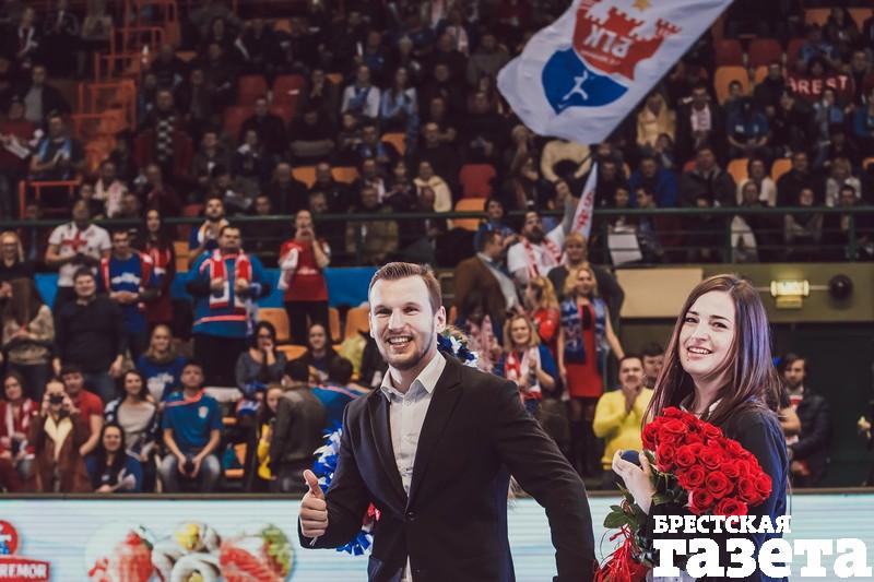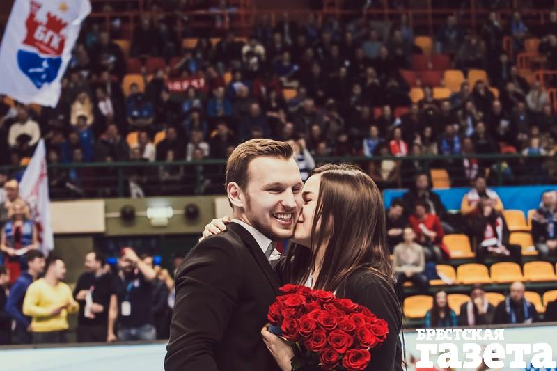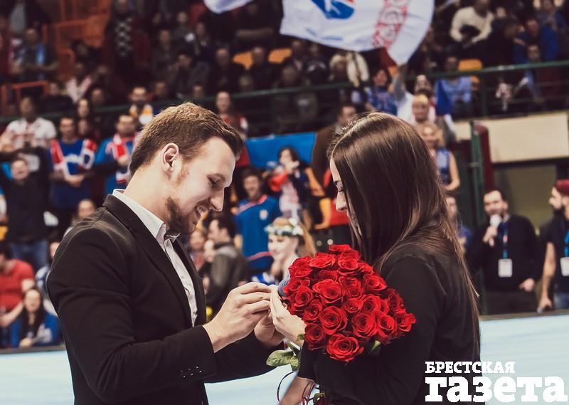 «Дорогая Ирина, я очень сильно тебя люблю! Я хочу, чтобы те моменты, которые мы переживаем вместе с тобой, продолжались вечно! Я люблю тебя! Выходи за меня замуж!» — произнес в микрофон Антон, стоя на одном колене перед Ириной в центре гандбольной площадки в «Виктории» 19 марта.