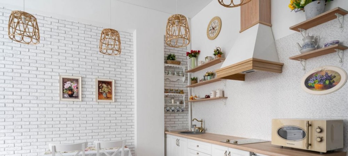В маленькой, но очень уютной студии сделан дизайнерский ремонт в стиле «прованс». За счет чего квартира выглядит игрушечной. Основной цвет стен и мебели — белый. В гостиной стена имитирует кирпичную кладку. Ахроматический цвет разбавляют вкрапления цветочных мотивов: будь то панно на стене, узоры на подушках или цветы в вазах на полках. Винтажный вайб создают аксессуары в виде плетеных абажуров, характерных картин на стенах, витиеватых узорах в декоре кровати, полках и других элементах.