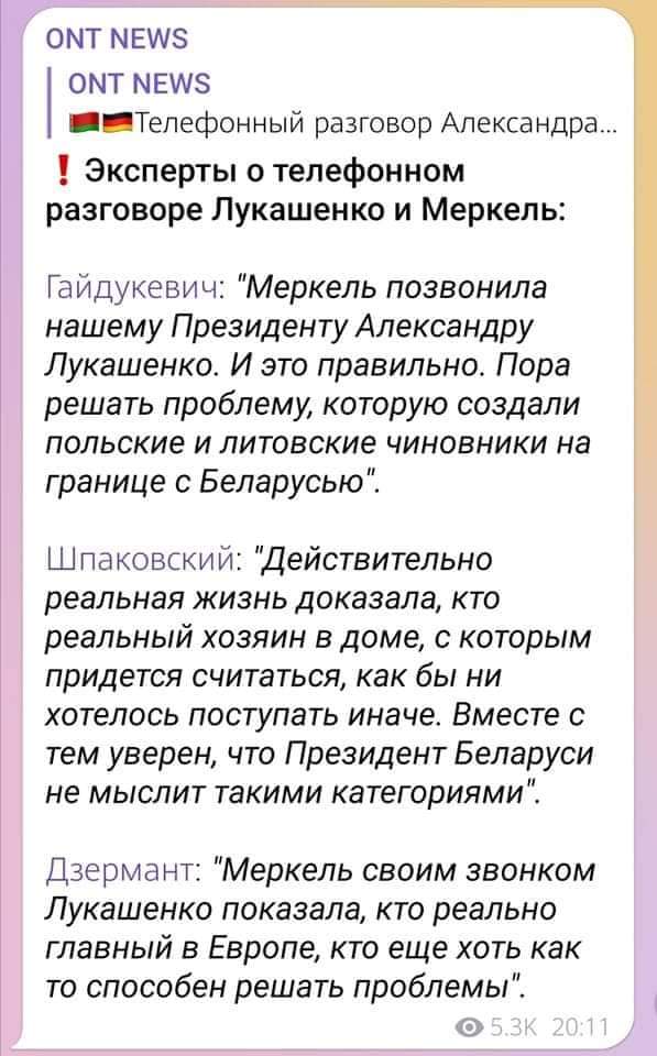 «Меркель своим звонком Лукашенко показала, кто реально главный в Европе, кто еще хоть как-то способен решать проблемы. Евробюрократия — политические импотенты, поляки — неадекватные ксенофобы».