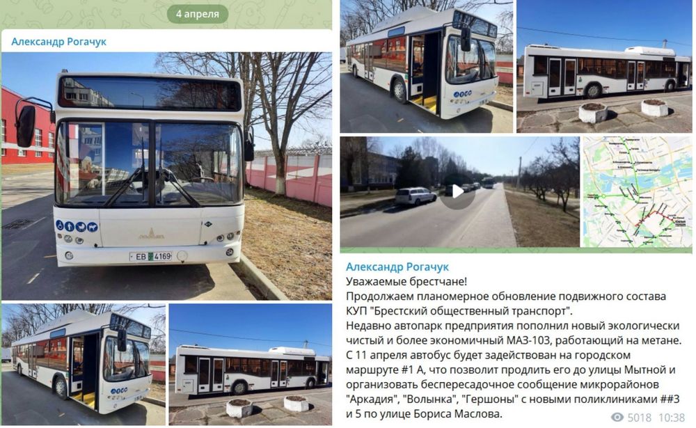 «Продолжаем планомерное обновление подвижного состава КУП «Брестский общественный транспорт». Недавно автопарк предприятия пополнил новый экологически чистый и более экономичный МАЗ-103, работающий на метане», – пишет Рогачук.