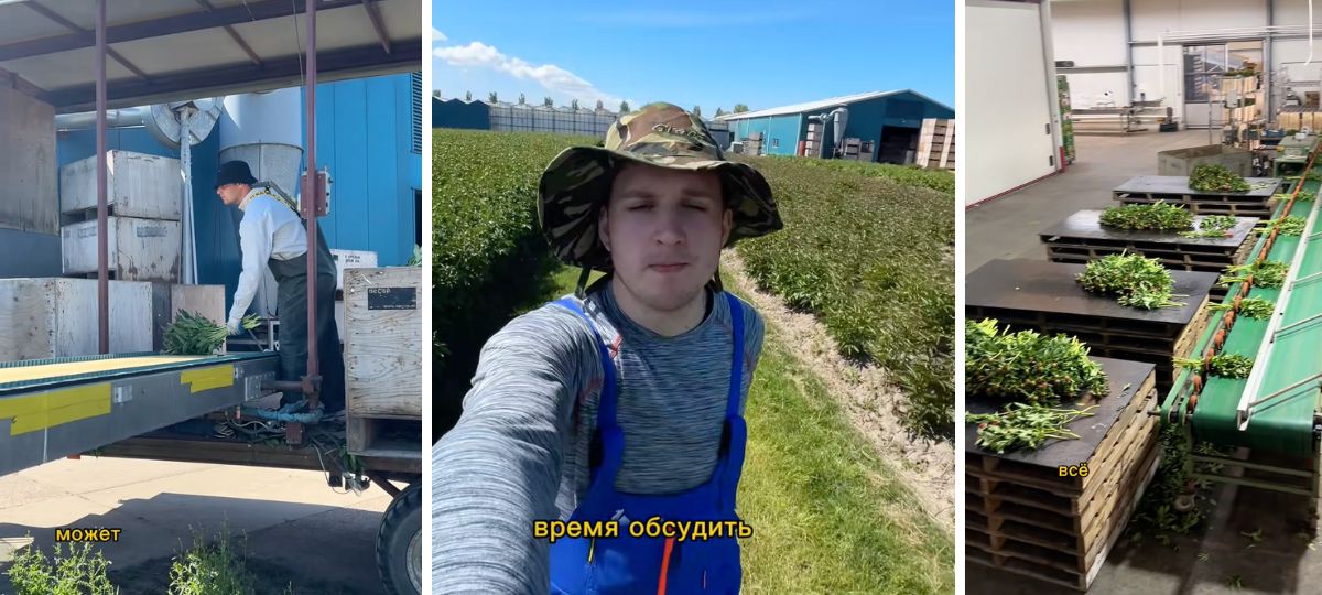 Судя по ролику, сейчас Иван работает на пионовой ферме в Нидерландах. Он говорит, что получает 14,06 евро в час (брутто) — это до налогов и удержаний. Нетто — примерно 13,5 евро. Беларус говорит, что у всех разная занятость: кто-то работает 160 часов, кто-то — 250.