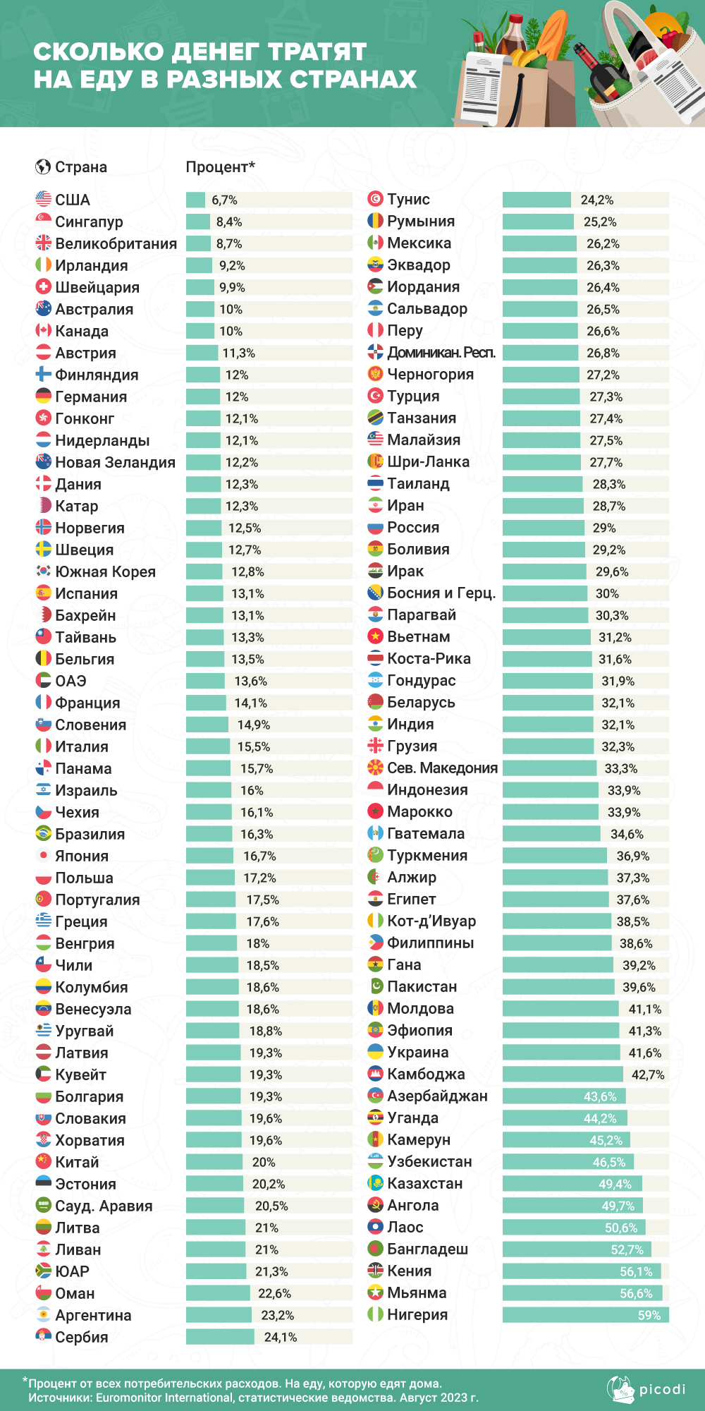 Из данных, собранных аналитиками Picodi.com, следует, что, в зависимости от страны, на продукты питания тратится от нескольких процентов до более половины всех потребительских расходов. Например, к странам, в которых на еду и безалкогольные напитки, потребляемые дома, в среднем приходится менее 1/10 всех расходов, относятся: США — 6,7%, Сингапур — 8,4%, Великобритания — 8,7%, Ирландия — 9,2%, Швейцария — 9,9%.