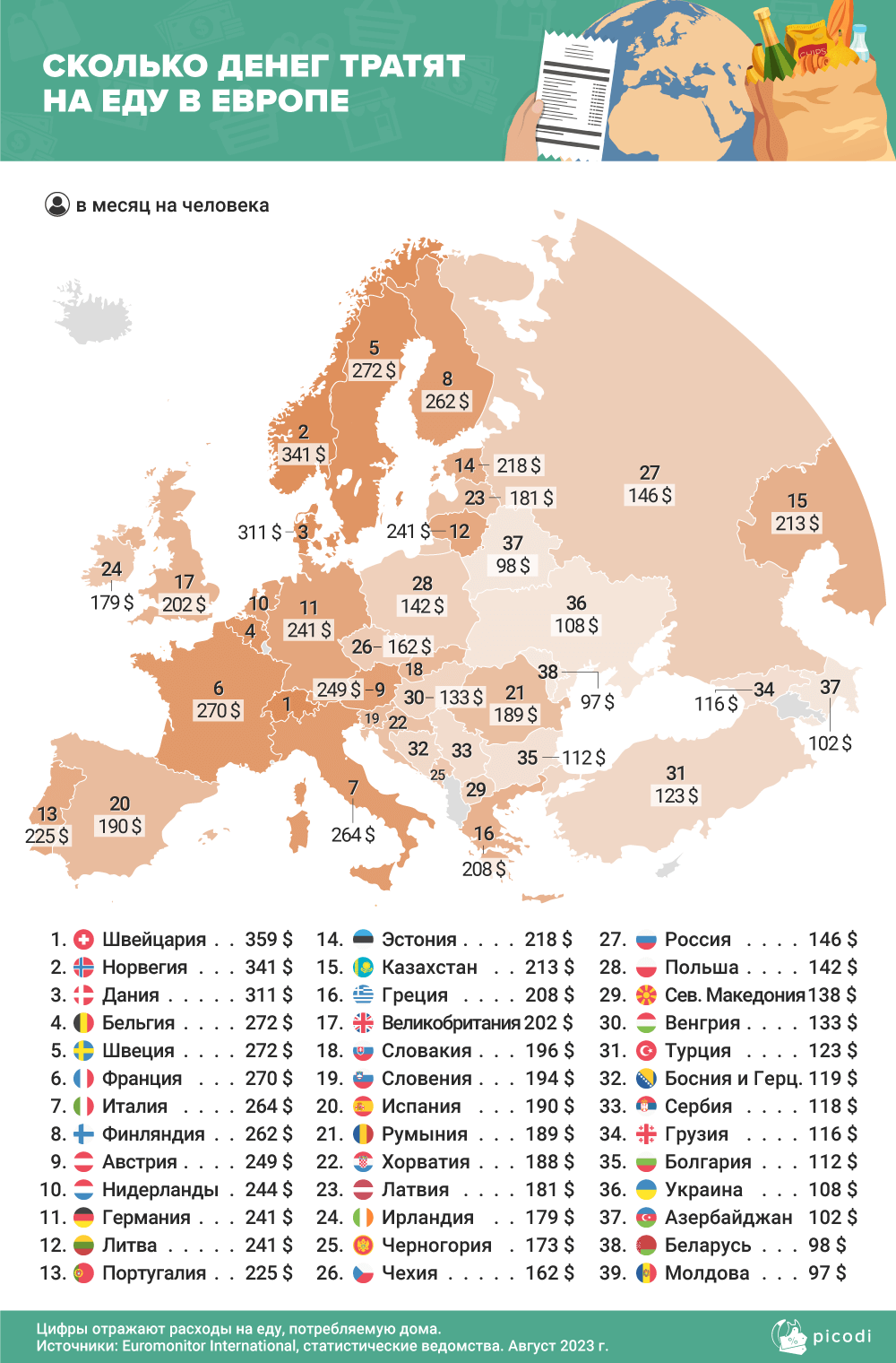 Среди европейских стран самые высокие расходы на продукты питания отмечаются в Швейцарии (359 $ в месяц), Норвегии (341 $ в месяц) и Дании (311 $ в месяц), что можно объяснить общими высокими ценами в этих странах.