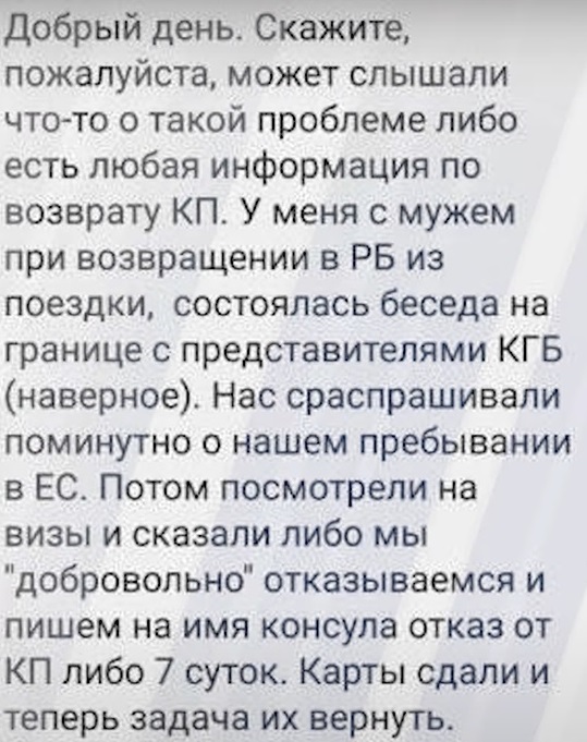 «Что за фигню пишут в других чатах. Якобы владельцев Карты поляка приглашают на беседу на белорусской стороне и предлагают добровольно отказаться от карты поляка, либо сутки… кто ехал с картой было такое???».