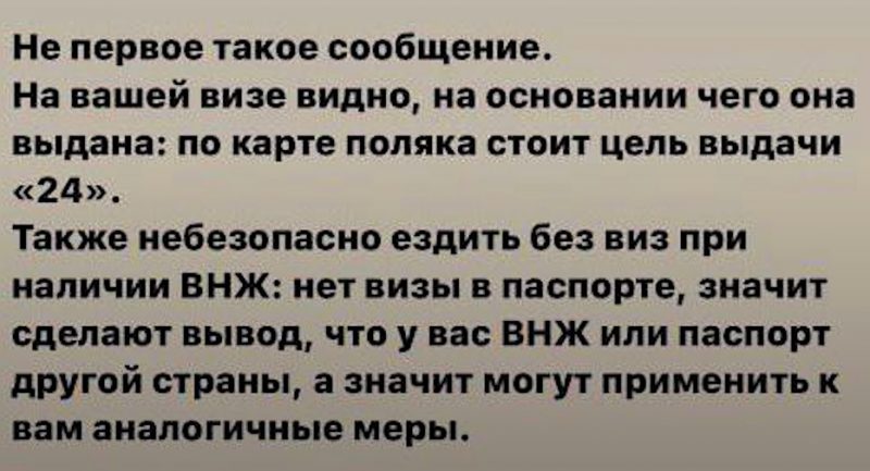 Один из беларусов уточнил, что на визе по карте поляка стоит «Цель выдачи 24». Поэтому пограничники видят, как получена виза. Небезопасно ездить в Беларусь без виз при наличии ВНЖ. Если пограничники увидят, что в паспорте нет визы, то тогда догадаются, что у вас есть ВНЖ. А дальше могут начаться проблемы.