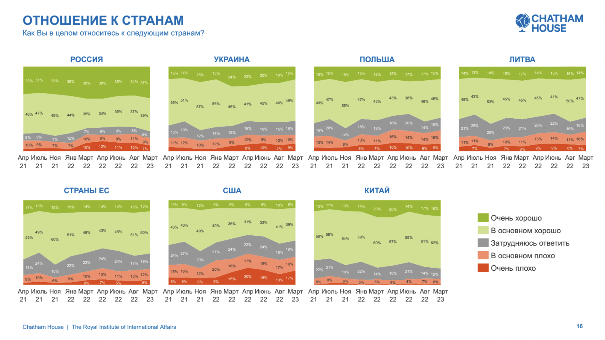 Согласно исследованию «Беларуская инициатива» Chatham House, отношение беларусов к России, Украине, Польше, Литве, странам ЕС и США за последние 2 года особо не изменилось. Россия по-прежнему остается страной, с высоким уровнем хорошего отношения – 37%. 17% респондентов очень плохо относятся к США.