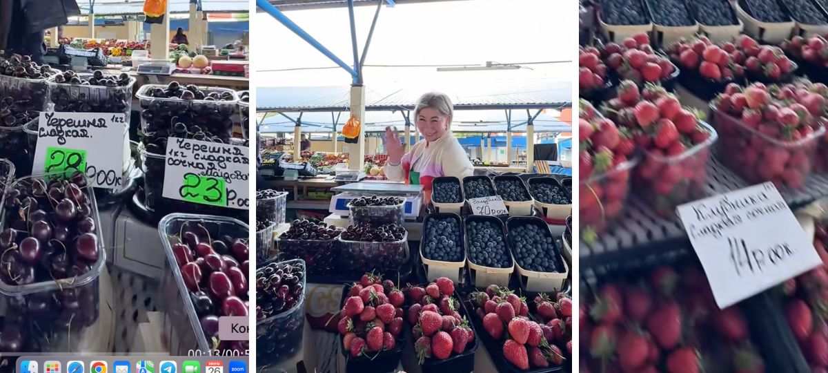 «Мы уже взяли черешню… два вида. У вас же самые лучшие ягоды?» — говорит блогер на фоне прилавков.